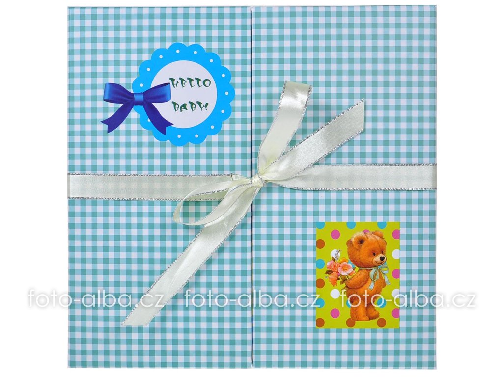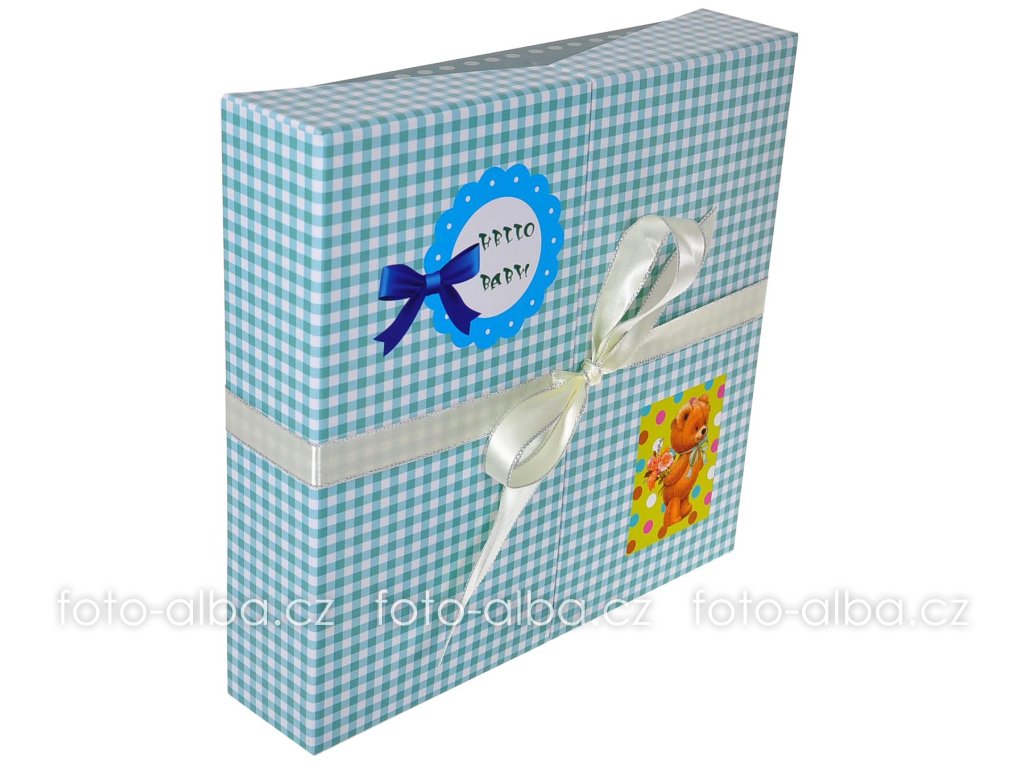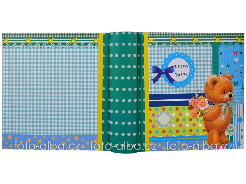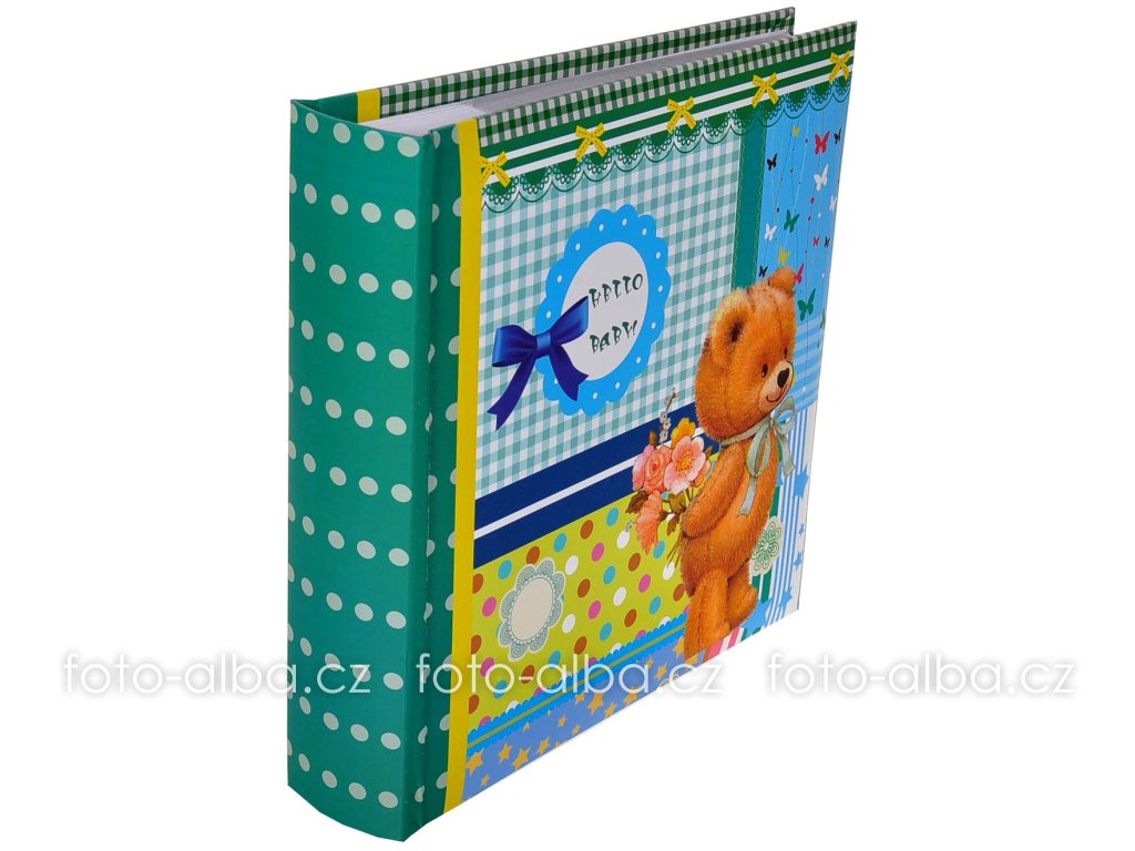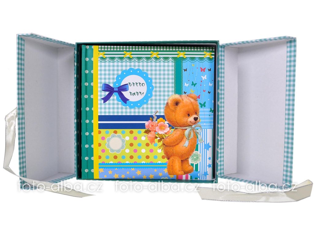 Dárkové dětské foto-album s medvědem na 200 foto, které je uloženo v krabici na mašli modro-zelené barvy. Foto-album s vašimi fotkami tak bude velmi dobře chráněné a bude vám dělat radost spoustu let. Kapacita je 200 fotek 10x15, papírové listy na šité vazbě a místo na popis po straně každé fotky.Doplňkové parametry